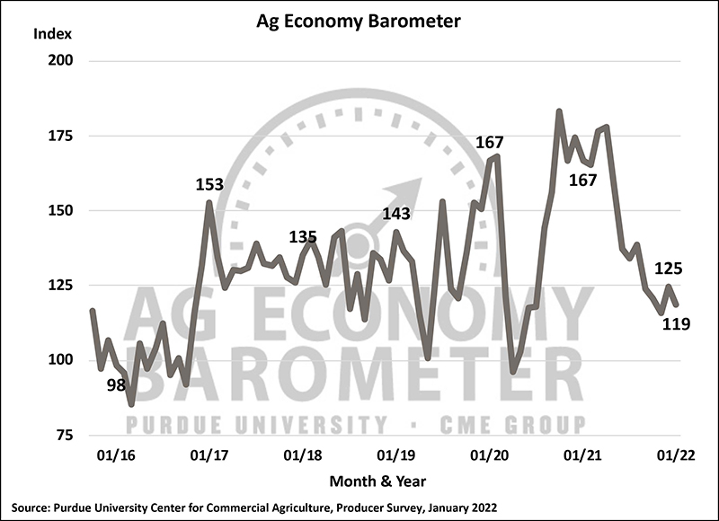 WEST LAFAYETTE, Ind. and CHICAGO — Farmer sentiment weakened in January as the Purdue University/CME Group Ag Economy Barometer declined 6 points to a reading of 119, its second-lowest reading since July 2020.