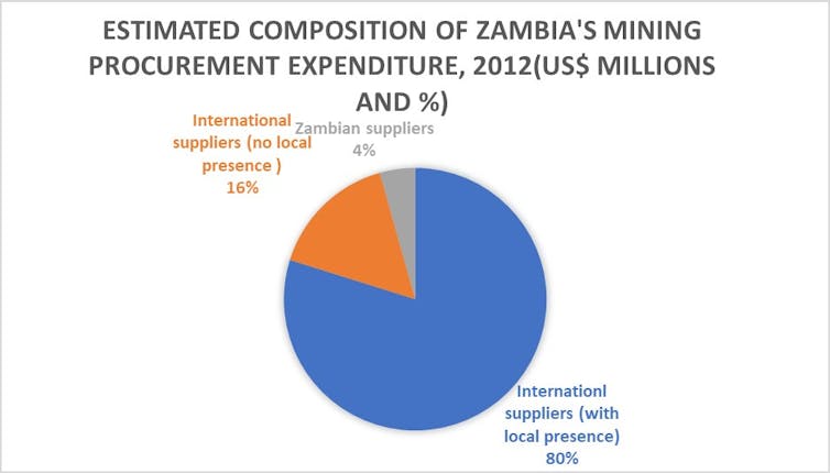 In 2012, 96% of all service were provided by foreign firms. Only 4% were provided by Zambian-owned firms. These were mostly supplying non-core goods and services such as catering, security and office maintenance.