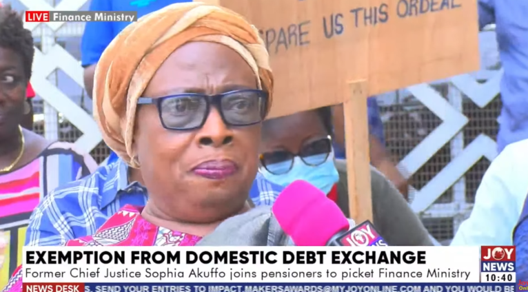 Accra, Ghana//-Former Chief Justice of Ghana, Sophia Akuffo is worried about the fate of pensioners who are crying out against the inclusion of their funds in the ongoing debt restructuring.