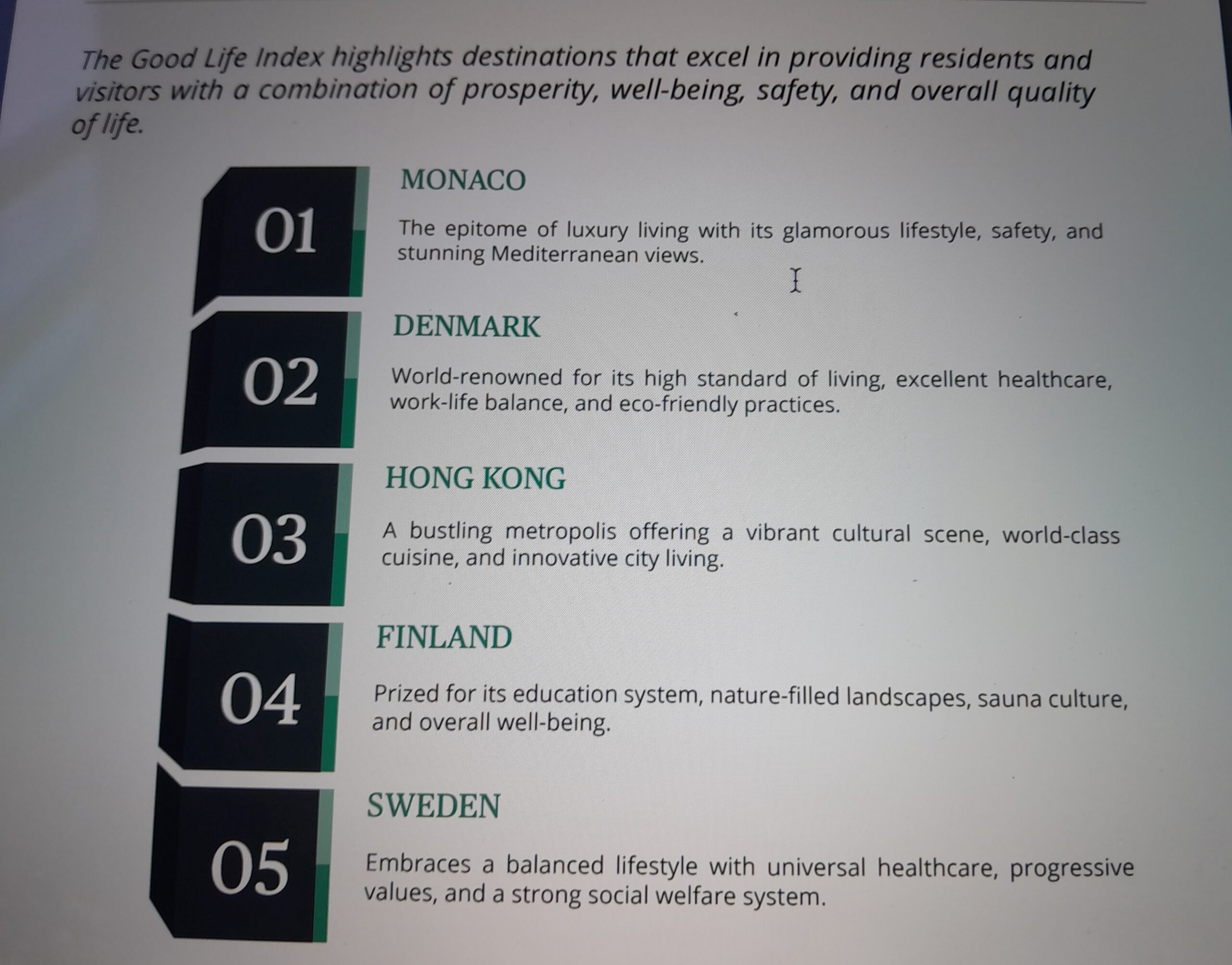 The Good Life Index showcases top destinations that prioritise the well-being and happiness of their residents, making them ideal places to pursue a high-quality lifestyle.