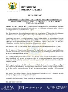 The government described the actions of the Israeli authorities as “unfairly targeting Ghanaian travellers” and said it conveys its strong reservations against the humiliating treatment of its citizens.