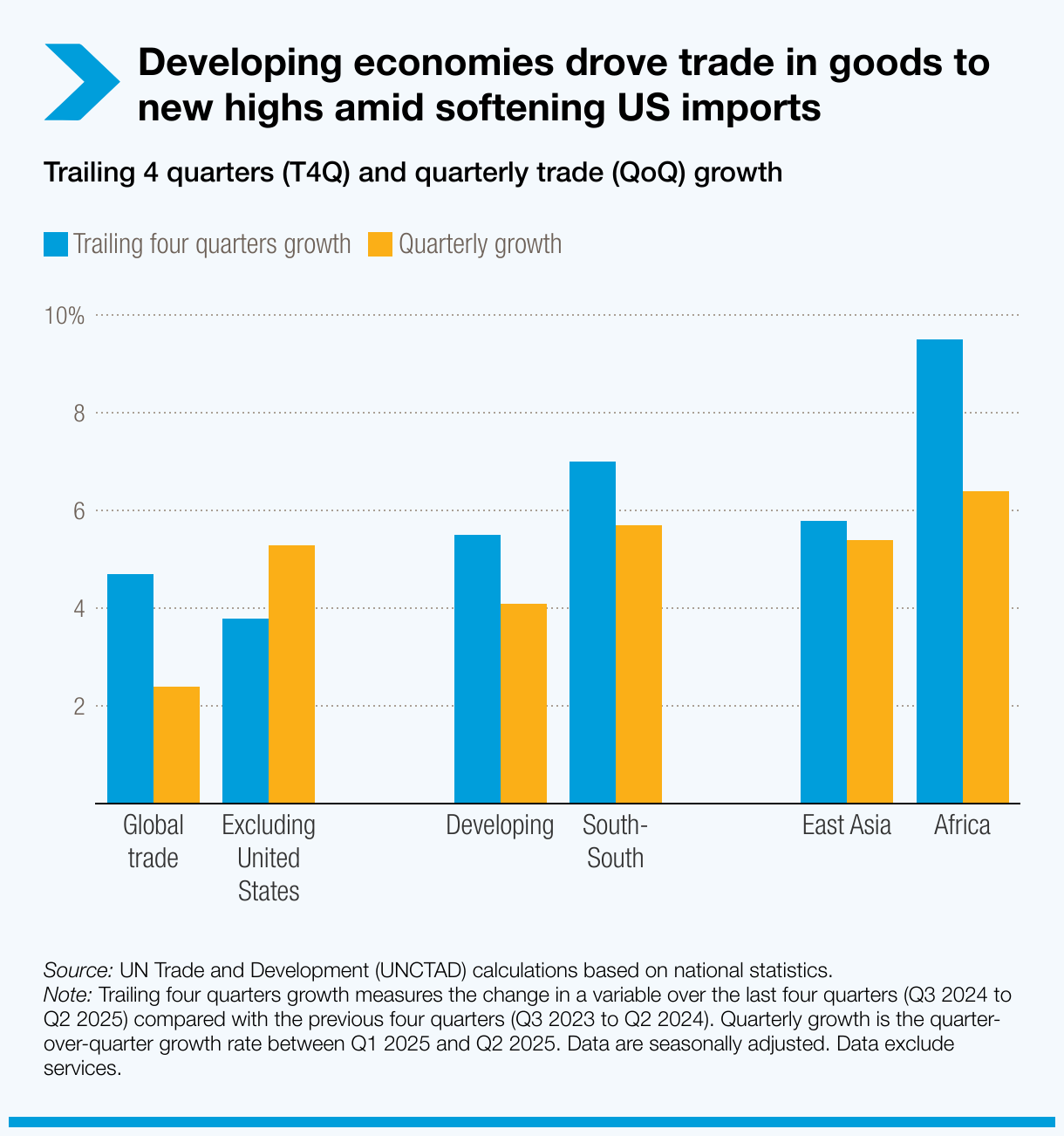 Growth in the second quarter was driven primarily by developing economies, supported by rising South–South trade. Weak United States trade performance weighed on the global average.