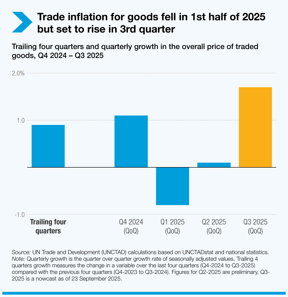 UN Trade and Development’s nowcast shows continued growth in the third quarter, with goods expected to expand by about 2.5% quarter over quarter and services accelerating sharply to around 4%. On a rolling annual basis, growth remains robust – about 5% for goods and 6% for services.