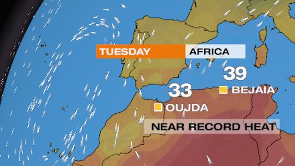 Bejaia, on the coast of Algeria, recorded a tremendous 39.5C on Tuesday which is within half a degree Celsius of the October record. It is a full 15 degrees above average.