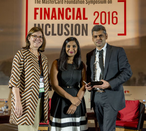 Le gagnant du prix Clients at the Centre 2016 de The MasterCard Foundationis est Ahmed Cassim, directeur général de la compagnie Hello Paisa Financial Services Group (droite). Le prix a été décerné par Ann Miles, Directrice Inclusion financière et Moyens de subsistance des jeunes à The MasterCard Foundation (gauche) et Sumaiya Sajjad, Directrice du programme (centre)