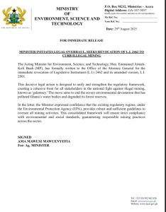 The request was officially communicated through a statement by the Ministry dated August 29, 2025. The controversial L.I. 2462 permitted mining in forest reserves, despite environmental concerns and calls for its repeal.