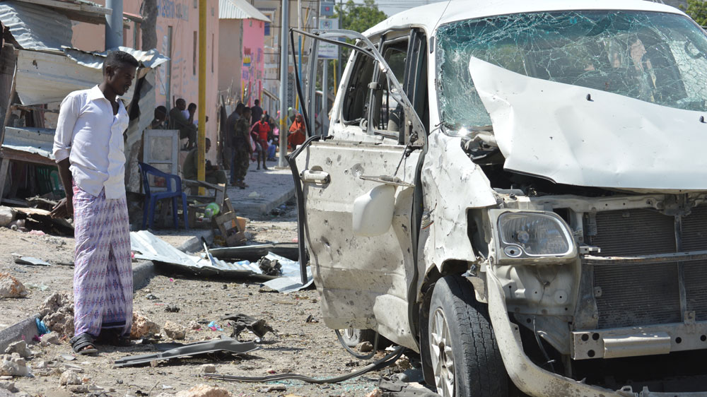 Captain Mohamed Hussein told The Associated Press news agency on Monday one blast took place as security forces were searching cars at a checkpoint a few hundred metres from the main base of the African Union peacekeeping force, AMISOM.