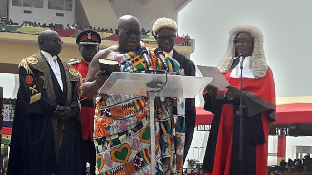 The new president took the oath of office at a ceremony in Independence Square in central Accra, marking the latest peaceful transition of power in the West African country.