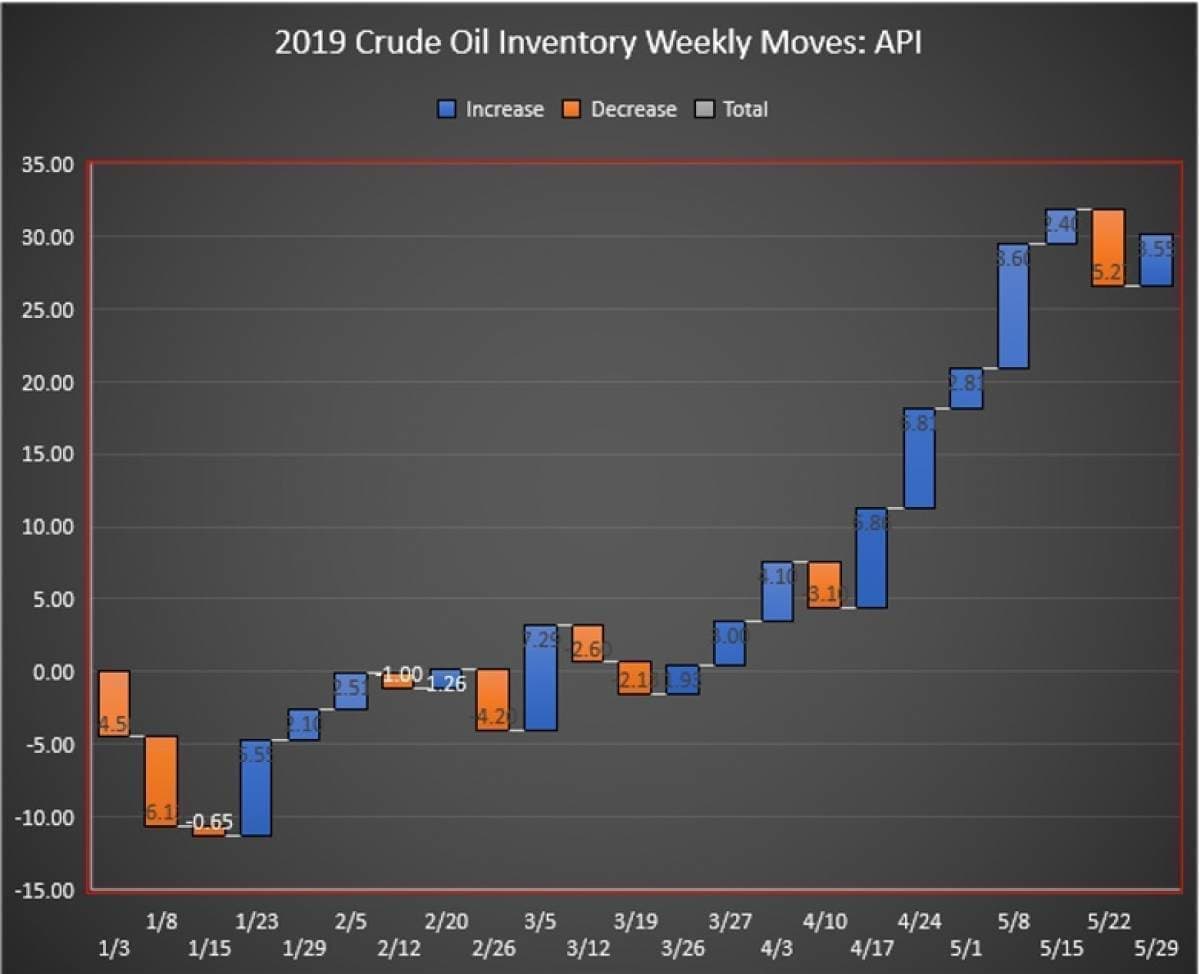 June 5, 2019//-The American Petroleum Institute (API) reported a surprise build in crude oil inventory of 3.545 million barrels for the week ending May 31, coming in over analyst expectations of a 208,000-barrel drawdown in inventories.