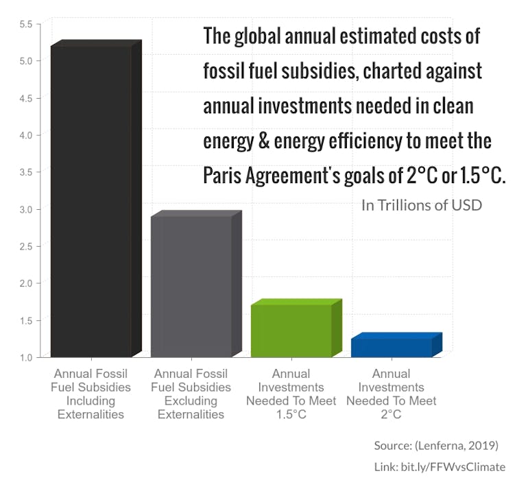 Global fossil fuel subsidies are so large, that if redirected, enough money would be available for investments in clean energy and energy efficiency needed to meet the Paris Climate Agreement targets.