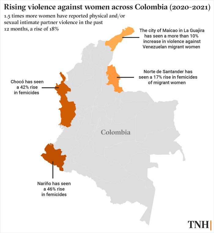 Map: Figures on Nariño and Chocó from the Colombia Femicide Observatory. Figures for Maicao in La Guajira from the UN’s Interagency Coordination Platform for Refugees and Migrants from Venezuela. Figures for Norte de Santander from El Pais. Figures on rising violence against women from UN Women.
